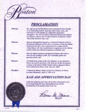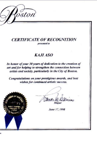「30年間功労賞」(米国・ボストン市)1998年 アートの創造、およびアーティストと社会の繋がりを強めることを助けるため、特にボストンの街のために捧げていただいた30年間に敬意を表します。あなたの誉れ高く継続した芸術の成功を心からお祈りいたします。 ![]() |