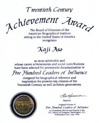 20世紀の業績表彰 「500人の指導者」(米国) 1997年 アメリカ合衆国に本部を置く、アメリカン・バイオグラフィカル・インスティテュートの理事会は、麻生花児氏を彼のキャリアの業績と社会貢献の実績を基に、最も称賛される人物に認定しました。そして、未来の世代の人々に経歴の引用と感動をもたらす為に計画された「500名の影響力のあるリーダー」の一人として公文書の中に永久保存となりました。 ![]() |