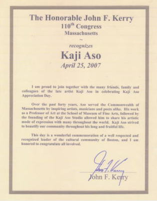 | 米国・マサチューセッツ州 ジョン・ケリー上院議員 マサチューセッツ州議会は、2007年麻生花児誕生日4月 25日を麻生花児に感謝する日」に制定する。 ![]() |