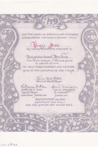 | 「ボストン名誉市民」(米国・ボストン市) 1980年 ボストン市民は、麻生花児氏が永きに渡り、ボストンをより 住みやすい街へと尽力されましたことを認定します。 ![]() |